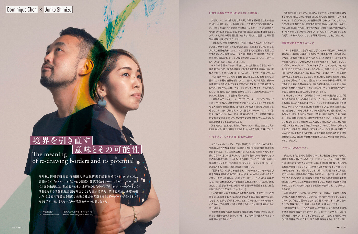 During the COVID-19 pandemic that is forcing us to live different lifestyles, many areas where the borderlines between conventional "districts" and "boundaries," such as real and virtual communication, became ambiguous. This issue's feature explore possible new val-ues and frameworks that may emerge in the future through borders that might also be transient if we take a bird's eye view of the world. We show new ways of viewing society and the power of imagina-tion through borders that we envision and where we ourselves are the subject.