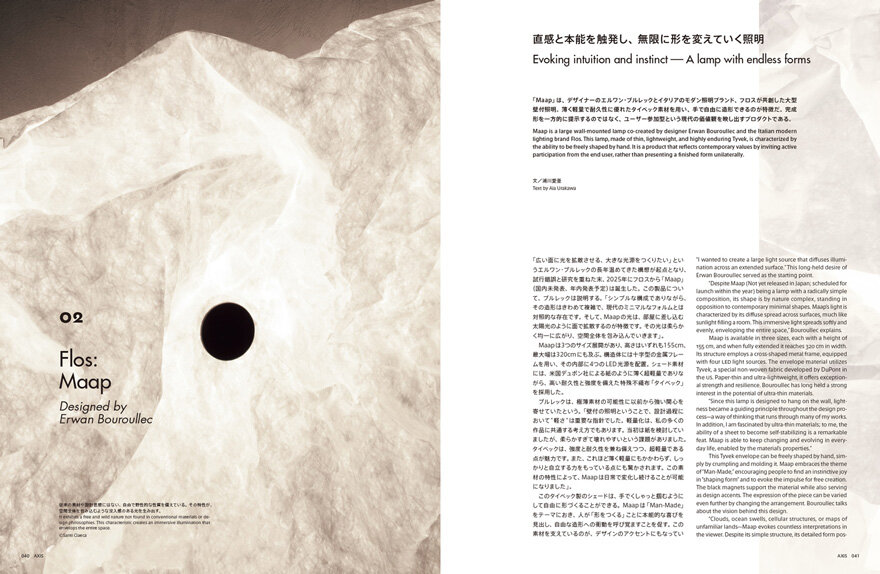 Maap is a large wall-mounted lamp co-created by designer Erwan Bouroullec and the Italian modern lighting brand Flos. This lamp, made of thin, lightweight, and highly enduring Tyvek, is characterized by the ability to be freely shaped by hand. It is a product that reflects contemporary values by inviting active participation from the end user, rather than presenting a finished form unilaterally.